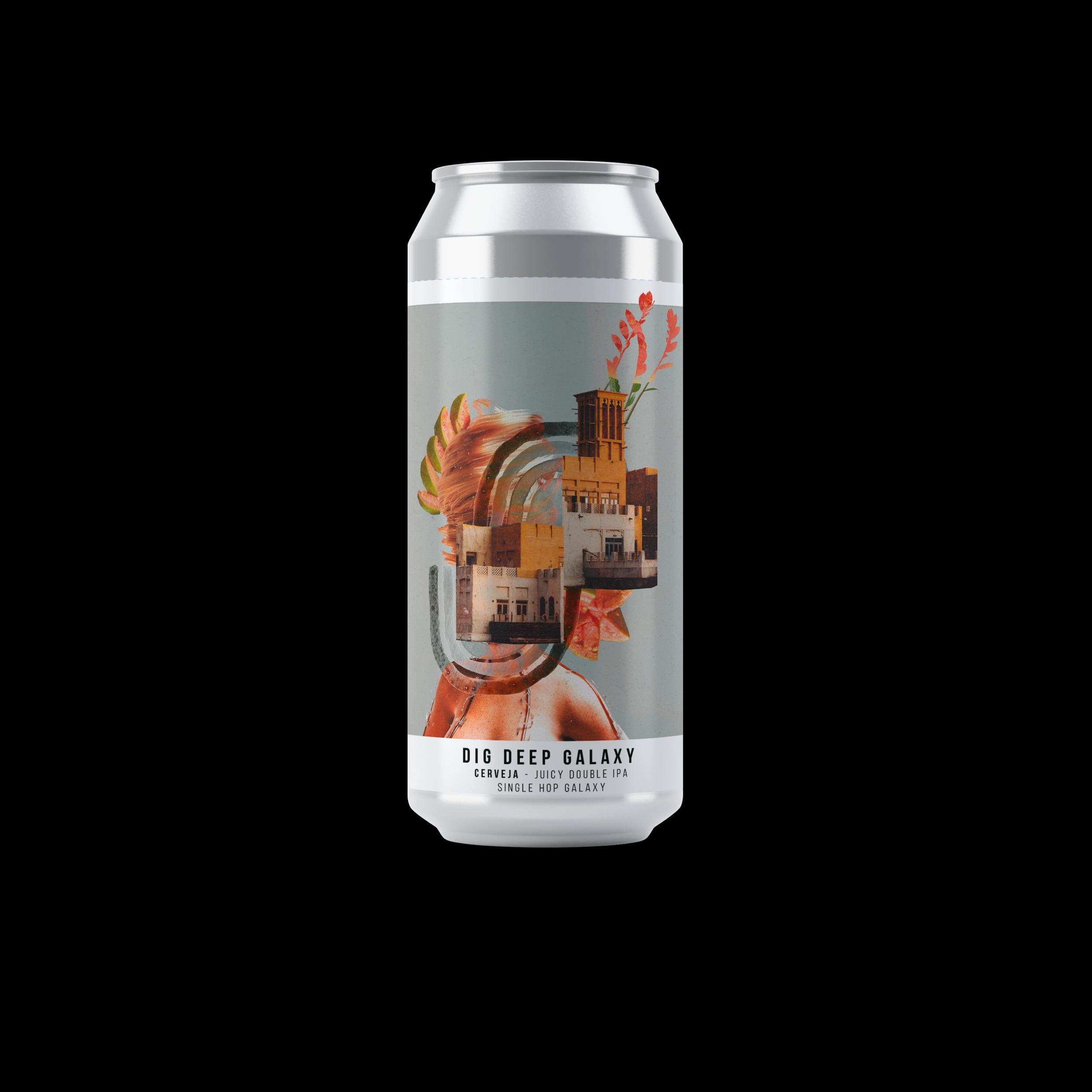 New England IPA 8,4% abv 473ml 8ª cerveja da série Dig Deep, desta vez com o lúpulo Galaxy, de Juicy Double IPAs single Hop da Octopus.